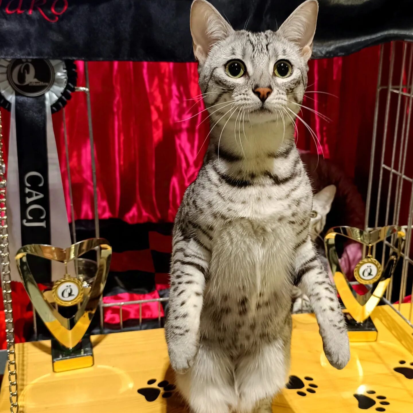 Förutom avel tycker jag om att åka på kattutställningar runtom i Sverige och ibland utomlands då jag får lära mig så mycket om de andra kattraserna samt träffa andra inom kattvärlden. Även om det inte är stor konkurrens för certifikat deltar jag på kattutställningar för att rasen ska bli mer synlig och fler som känner till denna underbara katt.